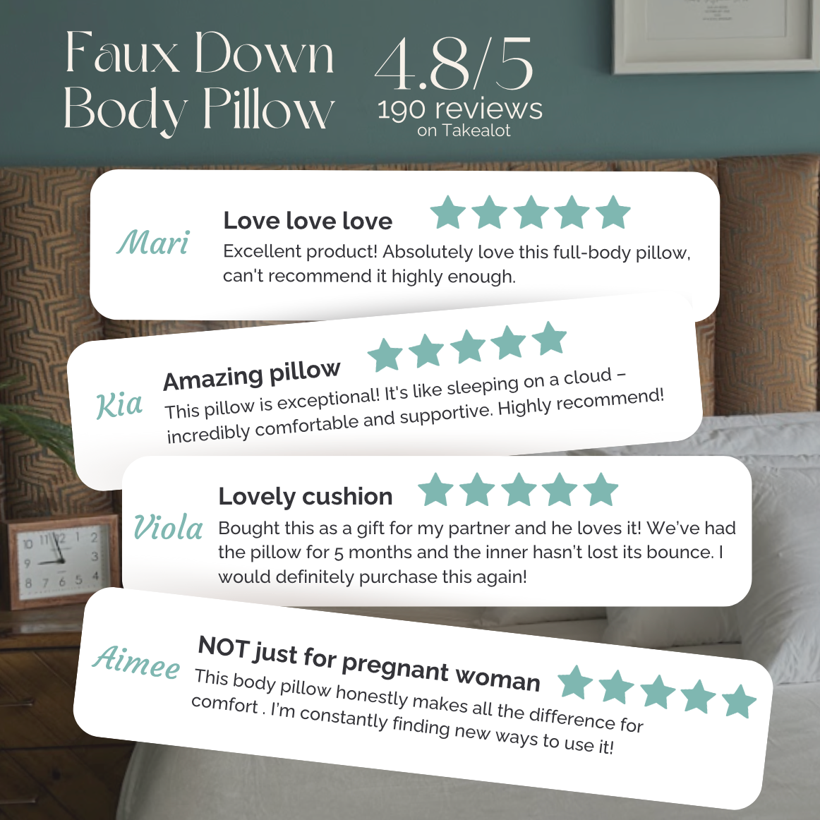 With over 600 glowing 5-star reviews across our product range, Cuddle Cushions is a name you can trust for comfort and quality. Our Faux Down Body Pillow alone boasts an impressive 4.8-star rating from over 200 happy sleepers, who rave about its softness, support, and ability to deliver the best night's sleep. Don’t just take our word for it—read what our customers are saying! Your comfort and satisfaction are our top priorities, and we’re here to help you rest easy.